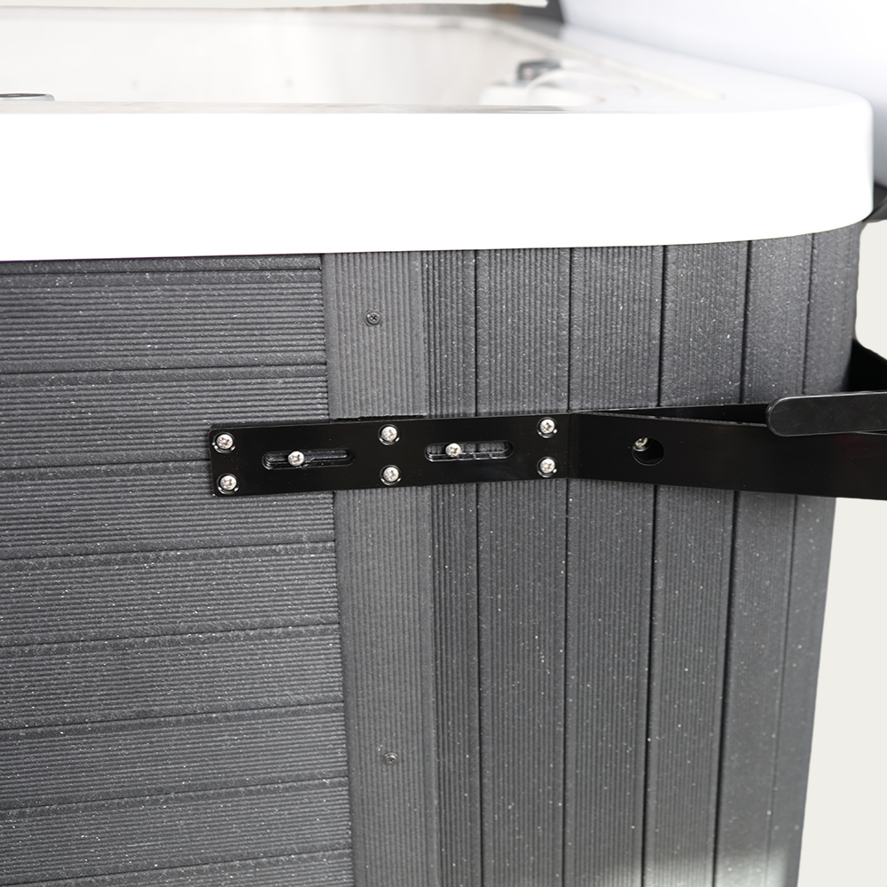 Kansimekanismi on suunniteltu niin, että se vie vain vähän tilaa: eristekansi mahtuu aukeamaan jopa 40 cm syvyisessä tilassa, joten se sopii erinomaisesti myös pieniin pihoihin tai terasseille, joissa tila on rajallinen. Pulverimaalattu alumiinirunko on kevyt mutta kestävä, ja musta viimeistely tekee siitä huomaamattoman osan altaan kokonaisilmettä.